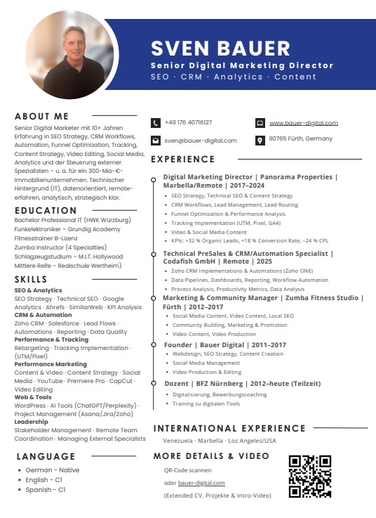Ich arbeite seit vielen Jahren im Bereich Digital Marketing, Content, CRM und SEO – mit einem starken technischen Hintergrund und internationaler Erfahrung. Hier ein Überblick über meinen Weg.